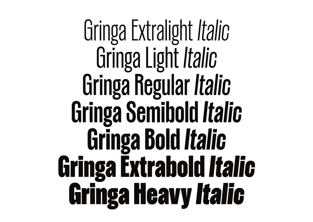 Gringa is a condensed grotesque typeface inspired by the classic designs of the Stephenson Blake series, but with a more geometric approach and a clean, modern style. Its curves are more refined, and the counterforms are meticulously crafted. The name "Gringa" references the prevalent use of this typographic style in the United States during the 19th century.